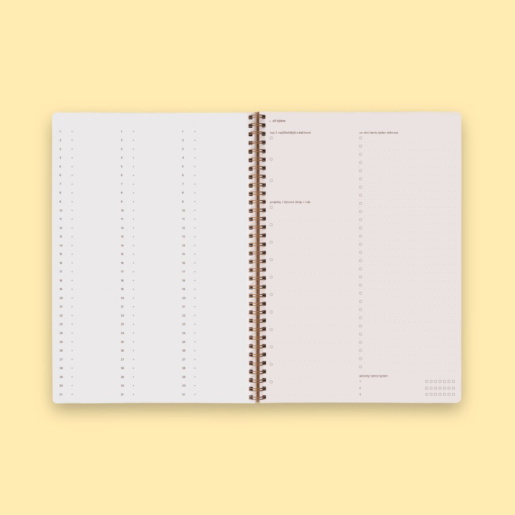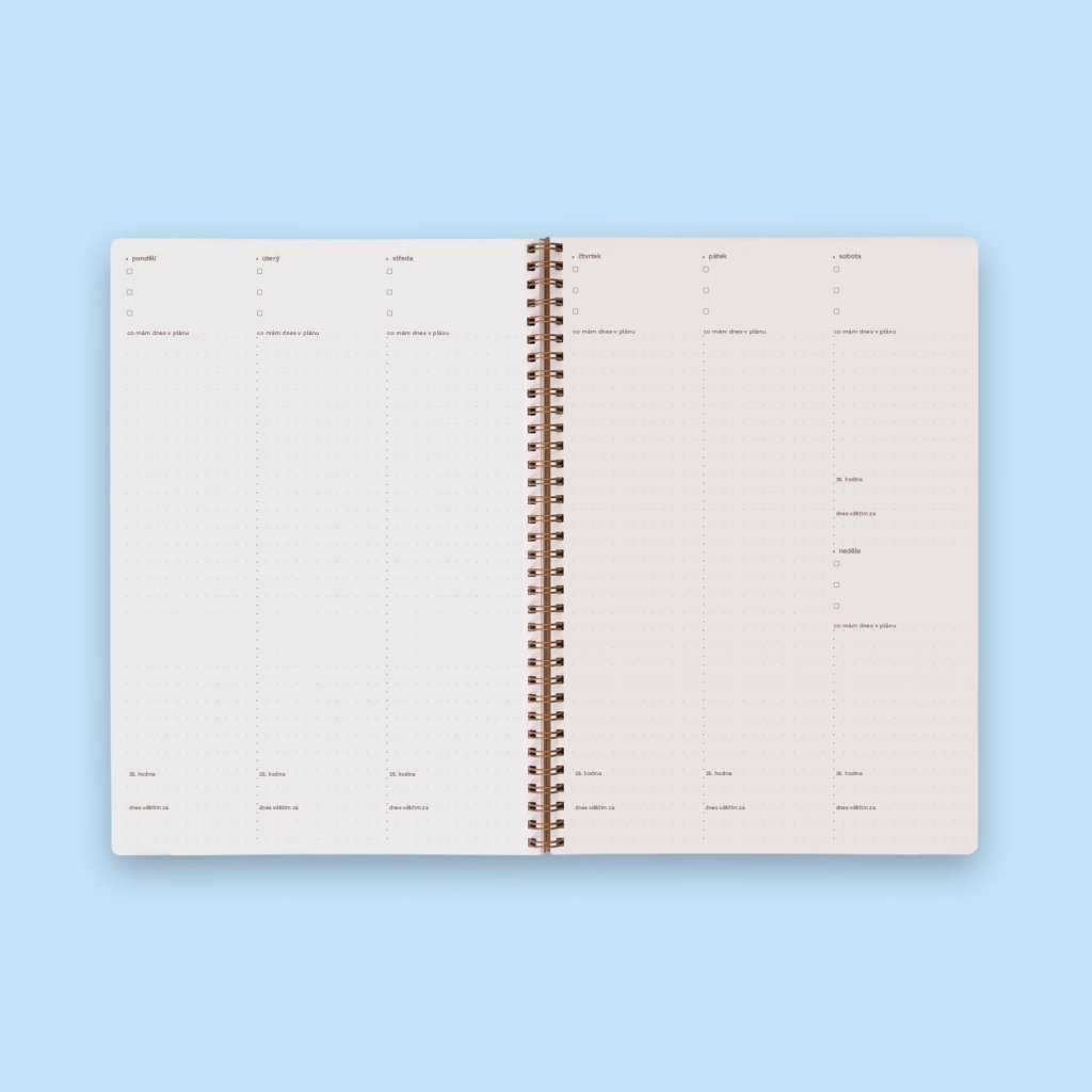 - Jasná struktura: Týdenní kalendárium umožňuje vizualizovat si rozvrh úkolů a lépe plánovat čas.